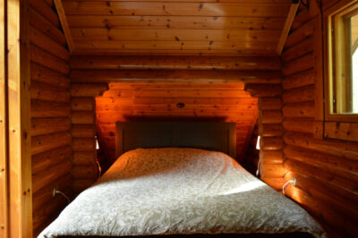 Ανεβαίνετε τα 7 ξύλινα σκαλοπάτια και βρίσκεστε στη μπροστά βεράντα. Εκεί υπάρχει και η είσοδος για τον κυρίως χώρο. Μπαίνοντας μέσα υπάρχει ο ενιαίος χώρος της κουζίνας και του καθιστικού. Η πλήρως λειτουργική κουζίνα, στα δεξιά, σας δίνει την δυνατότητα να ετοιμάσετε το φαγητό σας ή να πάρετε το πρωινό σας στο τραπέζι. Στα αριστερά σας βρίσκεται το καθιστικό. Περιέχει δύο καναπέδες που γίνονται διπλό κρεβάτι, τραπεζάκι, έπιπλο τηλεόρασης, επίπεδη τηλεόραση, ράδιο. Στο βάθος υπάρχει η ιματιοθήκη αριστερά, το μπάνιο στο κέντρο και η δεύτερη κρεβατοκάμαρα στα δεξιά. Ανεβαίνοντας την εσωτερική ξύλινη σκάλα στα αριστερά βρισκόμαστε στον επάνω όροφο. Εδώ θα δείτε το δεύτερο καθιστικό μας κάτω από το φεγγίτη με ένα καναπέ, μία πολυθρόνα και δύο μονά κρεβάτια που βρίσκεται στο θόλο της σκεπής και προσφέρεται για απομόνωση ή ακόμη και παιχνίδι για τα μικρά παιδιά που θέλουν να δημιουργούν το χώρο τους. Στα αριστερά υπάρχει η κεντρική κρεβατοκάμαρα με το διπλό κρεβάτι, μία πολυθρόνα, συρταριέρα και καθρέφτη. Στα δεξιά βλέπουμε την μπαλκονόπορτα που οδηγεί στο μπαλκόνι που βλέπει μπροστά στο δρόμο.